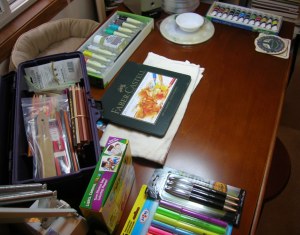 I cleaned the studio in eager anticipation of ‘the’ book. Yes, the book of all books. The Sketchbook Project 2011 book. The table is ready, the setting is perfect. Now all I have to do is wait for the post office to deliver my package.